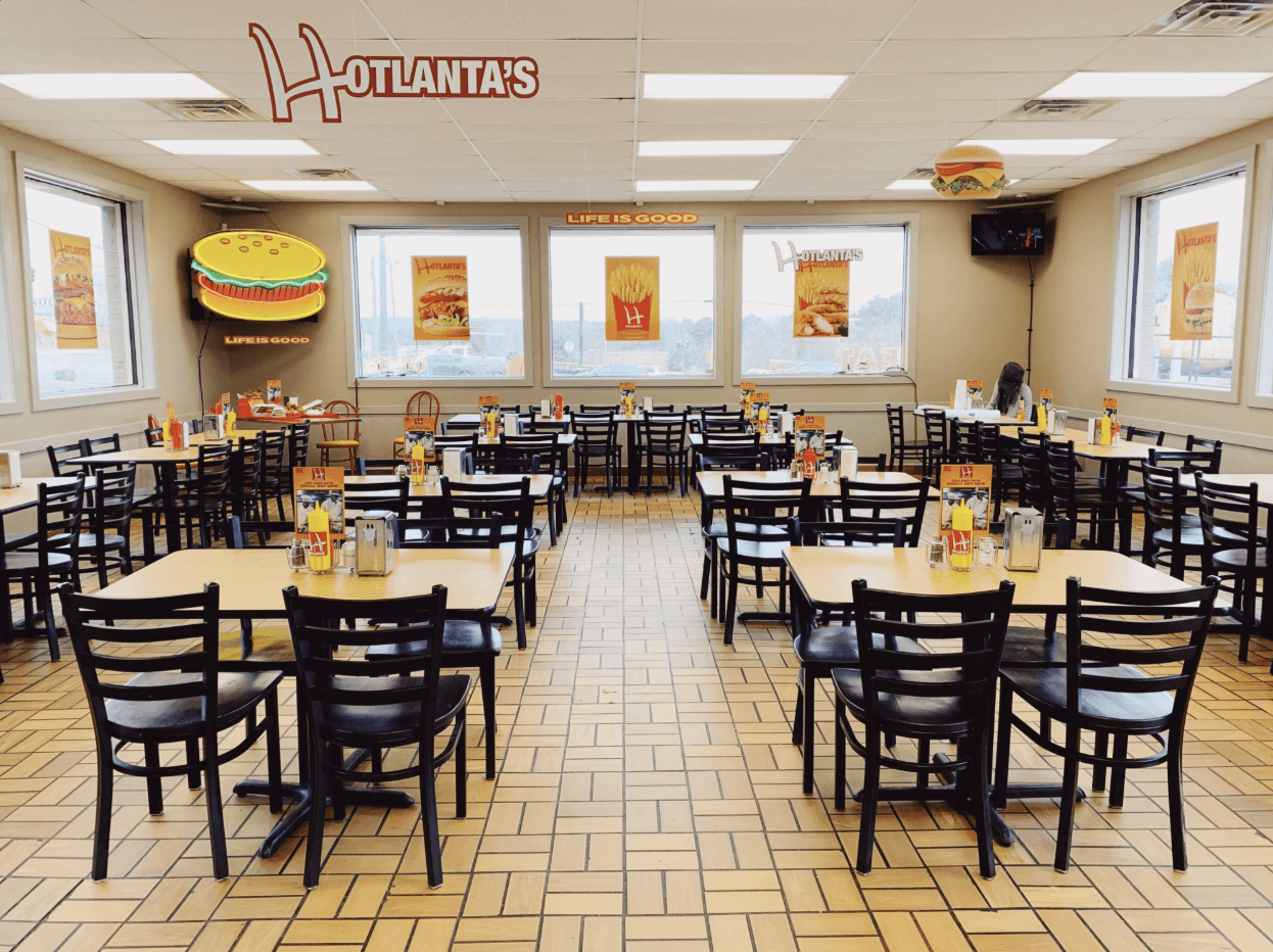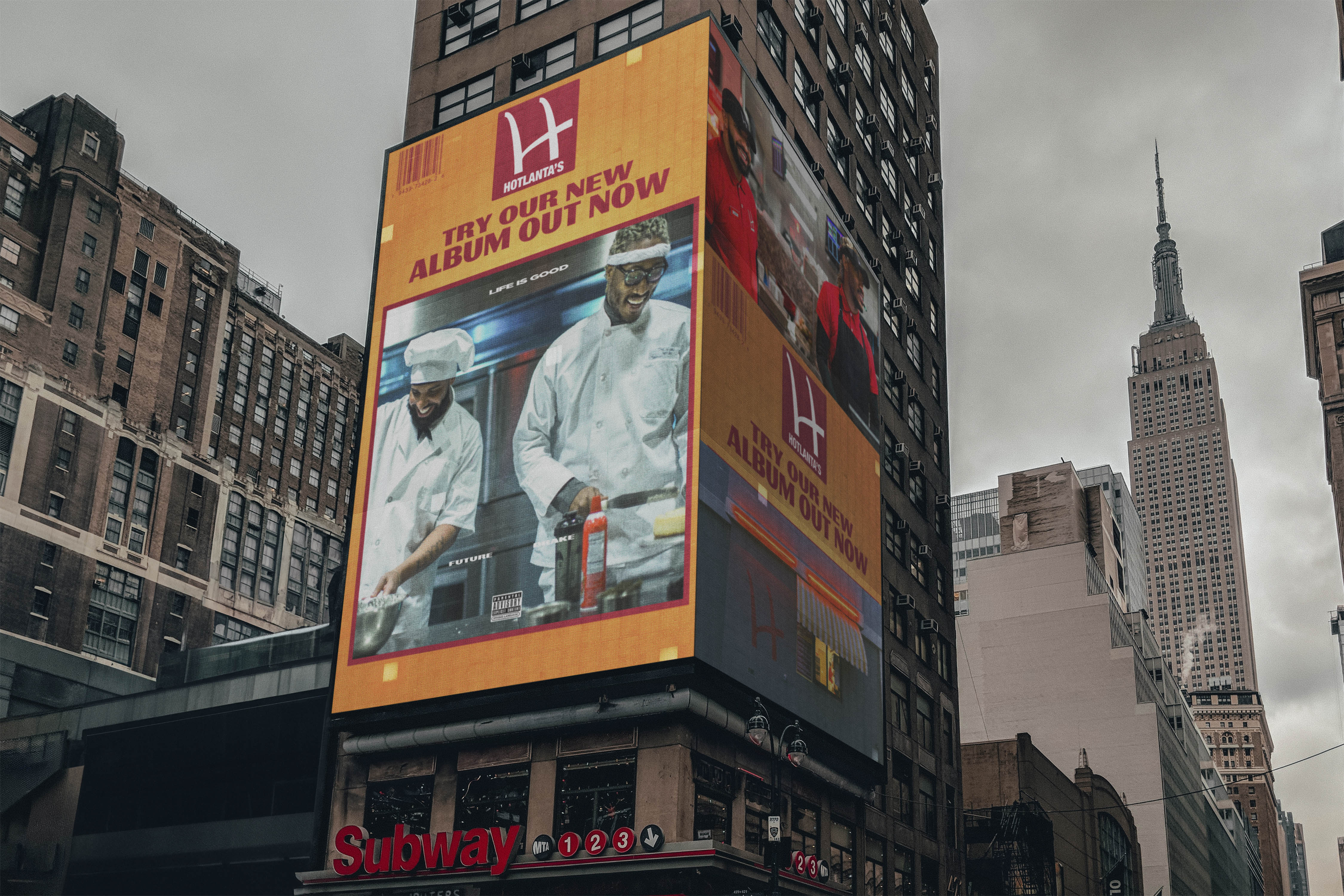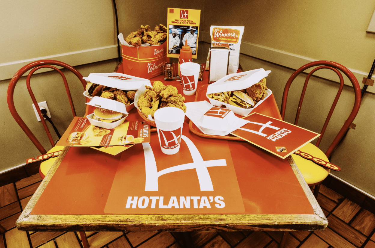 Our design team created custom branding elements for "Hotlanta", an off-brand fast food restaurant environment that maintained its own distinct identity while fitting seamlessly into the music video's narrative. The set design included custom signage, menus, and branded materials that captured the essence of a familiar fast food establishment while remaining legally distinct.
